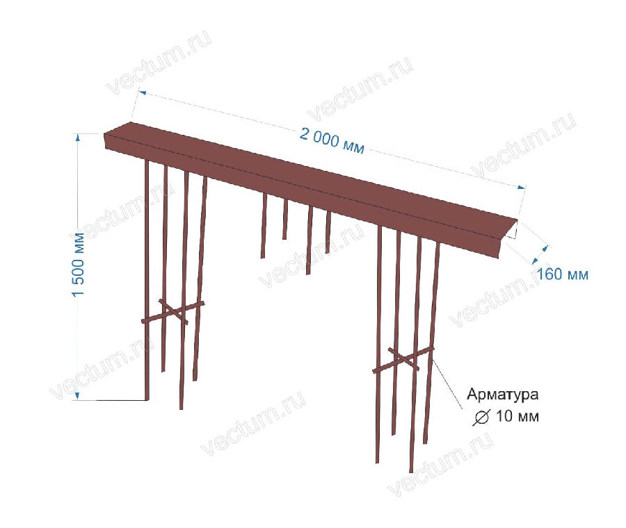 - Непосредственно к швеллеру снизу привязываются отрезки арматуры. Фундамент заливается из качественного бетона М 250 - 300, в качестве обрешетки используется стальная арматура.